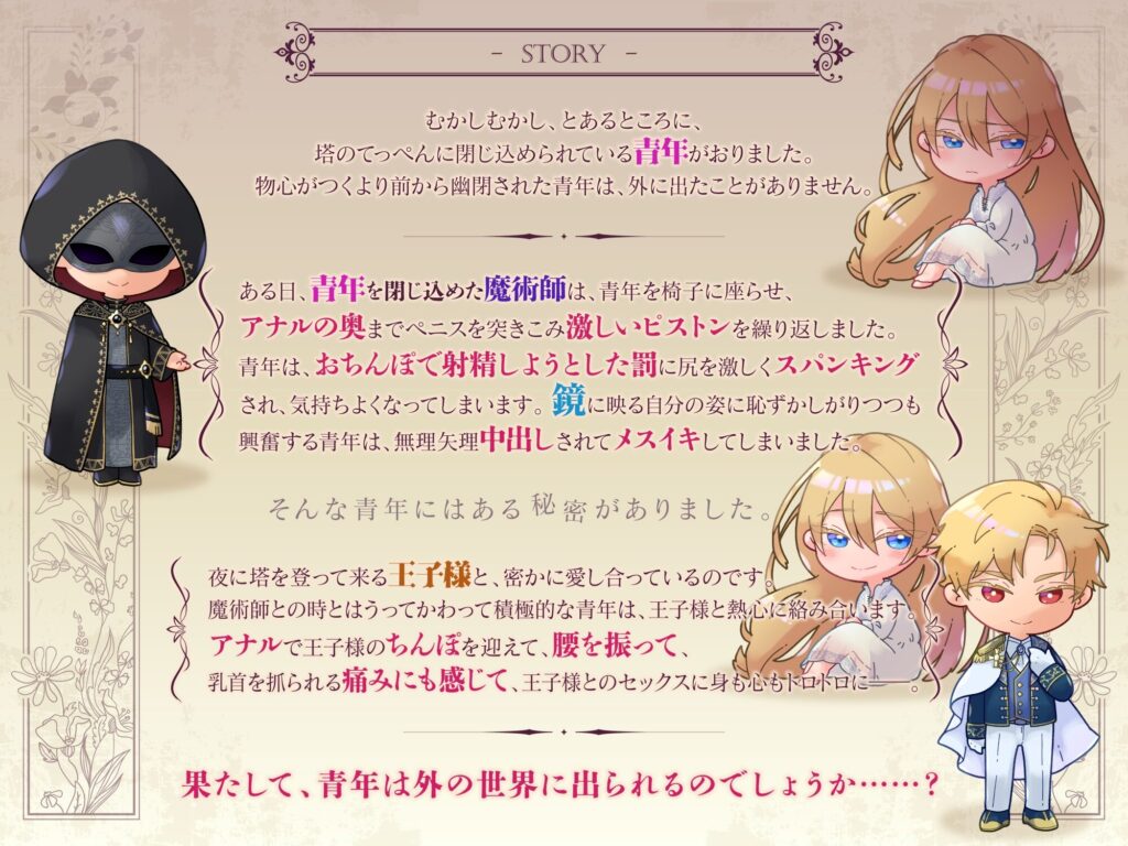 幼少期から魔術師に攫われて、塔に閉じ込められ監禁生活を送っているラプンツェル。外の世界に憧れを抱いてはいますが、ラプンツェルが話し掛けていた鳥にまで嫉妬をするような狂った魔術師がいるため、外に出ることは叶わず滅茶苦茶にされる毎日を送っています。